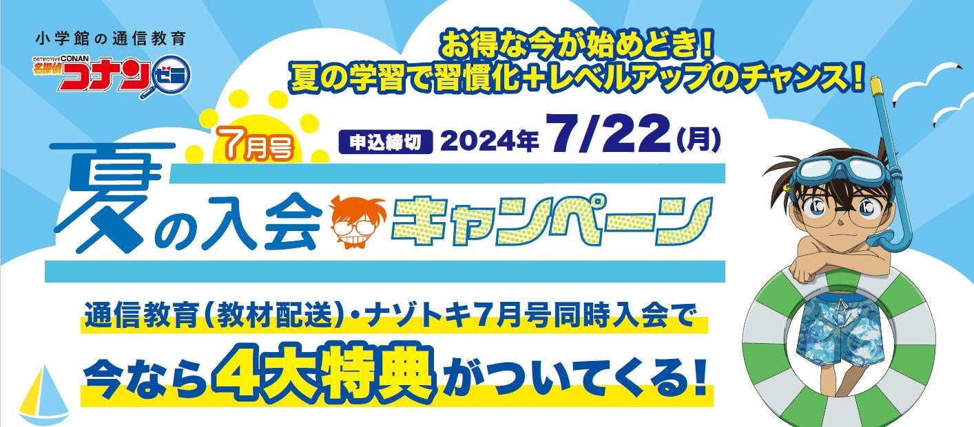 『小学館の通信教育 名探偵コナンゼミ』は、通信教育(教材配送)とナゾトキの7月号に同時入会すると4大特典が手に入る「7月号夏の入会キャンペーン」をスタートしました。