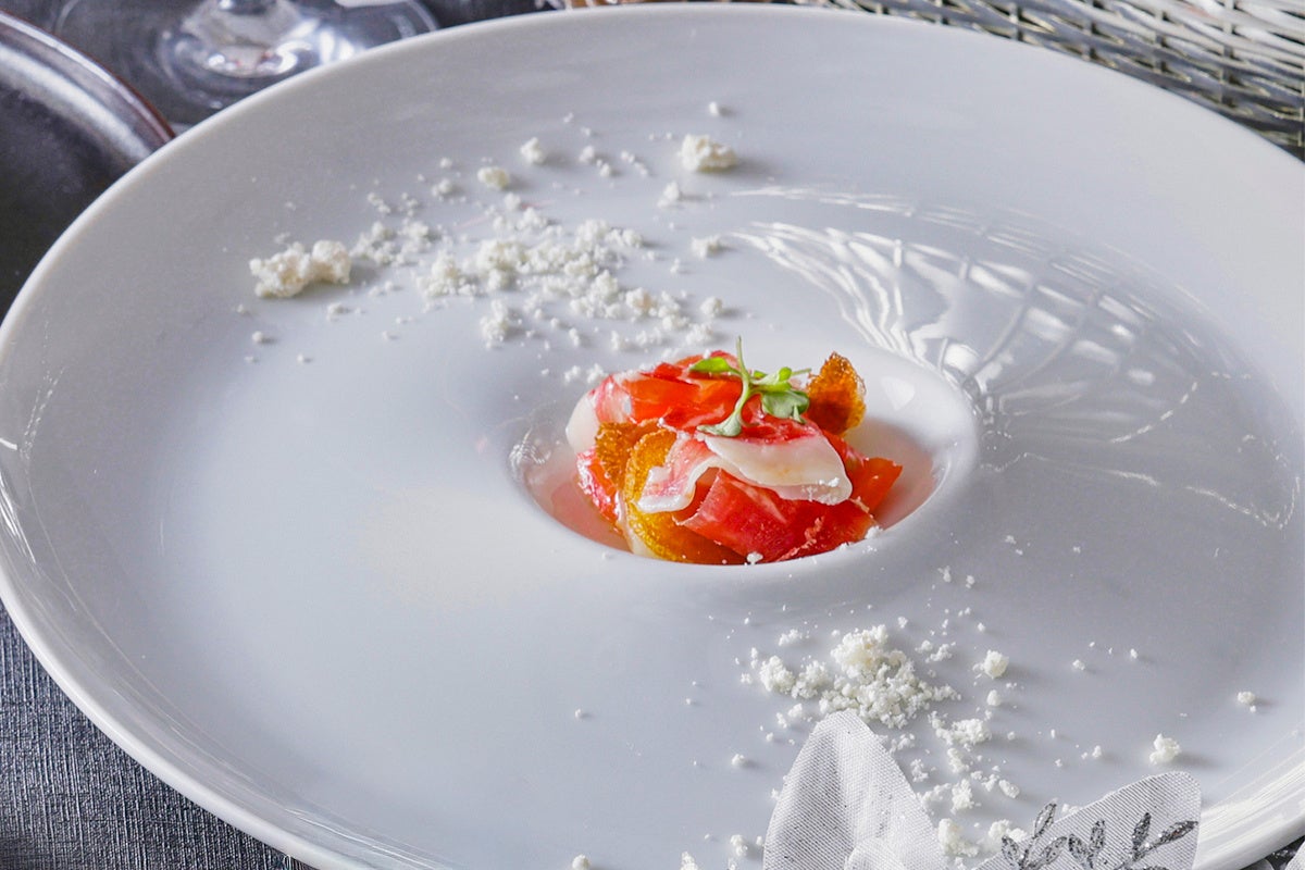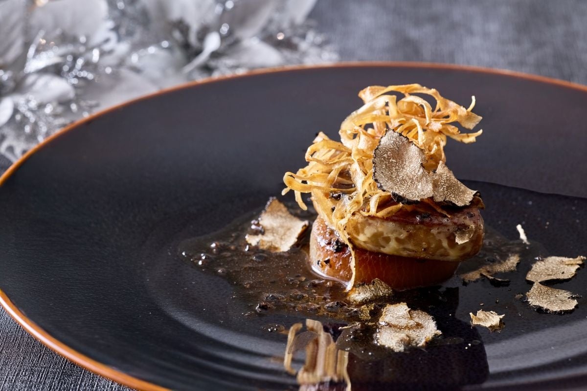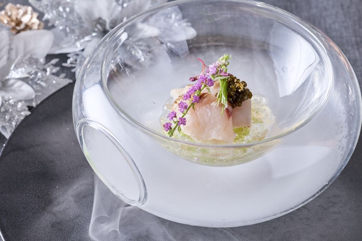 2025年12月20日(土)~25日(木)に、ランチ(3コース)・ディナー(4コース ※22日(月)・23日(火)以外は3コース)ともにクリスマス限定の特別コースを販売いたします。炎が高く上がる大迫力のフルーツトマトのフランベから始まり、オシェトラキャビアを添えた寒ブリとのどぐろの炙りの冷前菜は、ドライアイスの演出で思わず写真を撮りたくなる一品です。 温前菜のフォアグラやトリュフをふんだんに使用した、フォアグラカナールと京野菜の聖護大根のポワレは、スタッフが目の前でトリュフを削るため、香りやパフォーマンスをお楽しみいただけます。活伊勢海老のグリルは、濃厚な雲丹のソースを贅沢に使用しており、伊勢海老との相性抜群で特別感あふれる一品です。コースの最後を飾るデザートでは、クリスマスリースをモチーフに苺やピスタチオを使用し、パティシエのこだわりが詰まった色鮮やかな可愛らしい一皿とお飲み物を提供いたします。