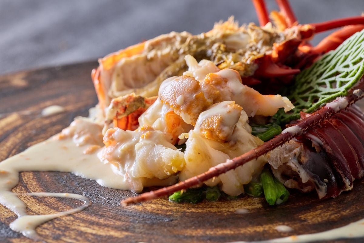 活伊勢海老のグリル 縮みほうれん草のソテーと一緒に