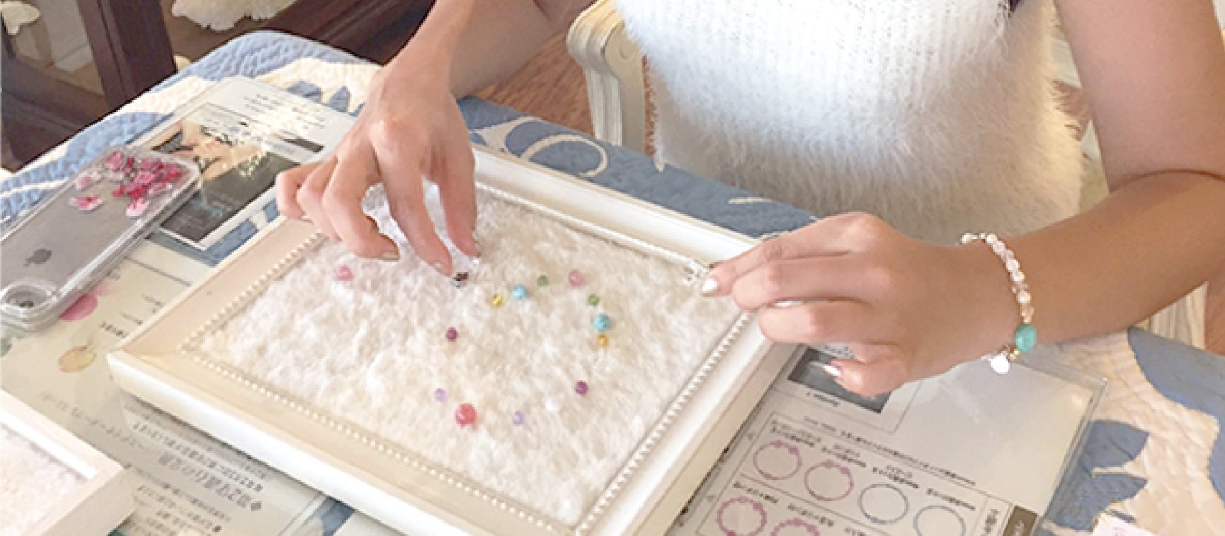 2.自分のサイズに合わせて、パワーストーンやパーツを選びデザインして並べていくだけ。