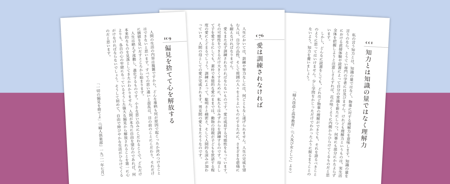 いつでも・どこでも・どこからでも読めて、あなたの背中を押す名言シリーズのラインナップに、初の女性著者である『与謝野晶子 愛と理性の言葉』が加わり、更に個性豊かになりました。