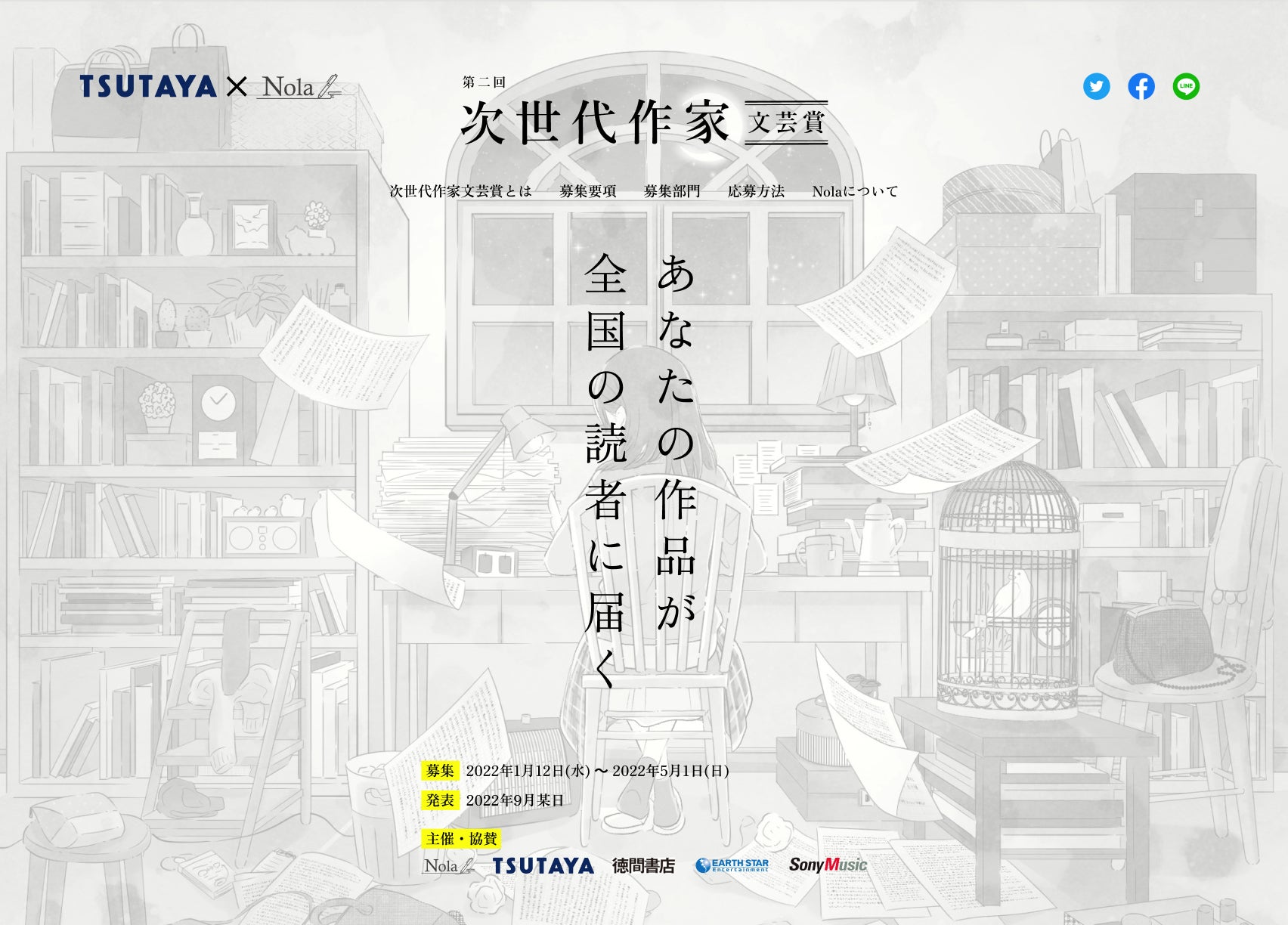 TSUTAYAと「Nola」が共催する、これからの書籍・漫画業界を担う次世代作家を支援することを目的とした公募の文芸賞です。