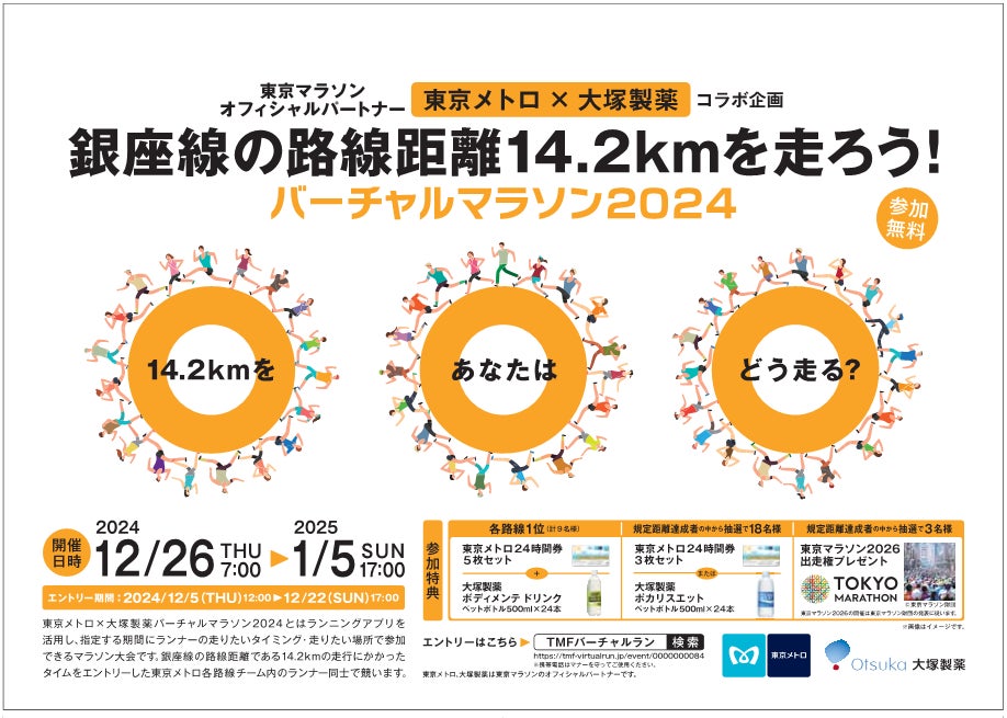 12月5日(木)~12月22日(日)の間にエントリーページ(https://tmf-virtualrun.jp/event/0000000084)から事前にエントリーいただき、2024年12月26日(木)~2025年1月5日(日)のイベント開催期間中に、東京メトロ銀座線の路線距離である14.2kmを走破したタイムを競うイベントです。バーチャルランのため走るコースはランナーが自由に設定することができ、時間・場所を選ばず参加可能です。エントリー時に、東京メトロ全9路線のうち任意の路線チームを選択いただき(規程距離は同じ)、各路線チームで1位となったランナーには、賞品を付与します。また、完走したランナーの中から抽選で3名様に東京マラソン2026出走権をプレゼントします。