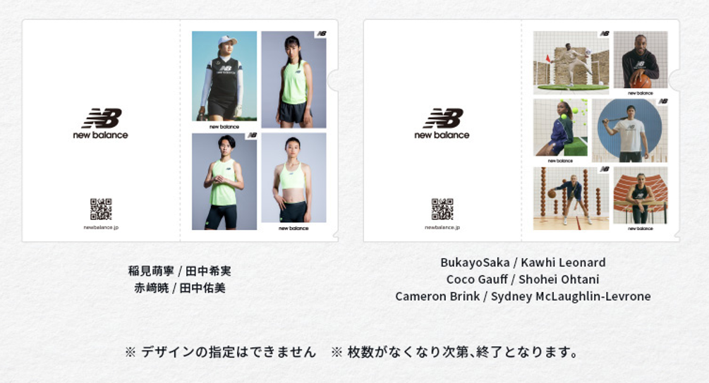 ニューバランスの契約アスリート、TeamNBの稲見萌寧プロ、田中希実選手、赤崎暁選手、田中佑美選手、ブカヨ・サカ選手、カワイ・レナード選手、ココ・ガウフ選手、大谷翔平選手、キャメロン・ブリンク選手、シドニー・マクラフリン・レブロン選手デザインの、A4サイズ オリジナルクリアファイルを、スポーツカテゴリのアイテム(KIDS含む)をご購入いただいた方に先着でプレゼントいたします。