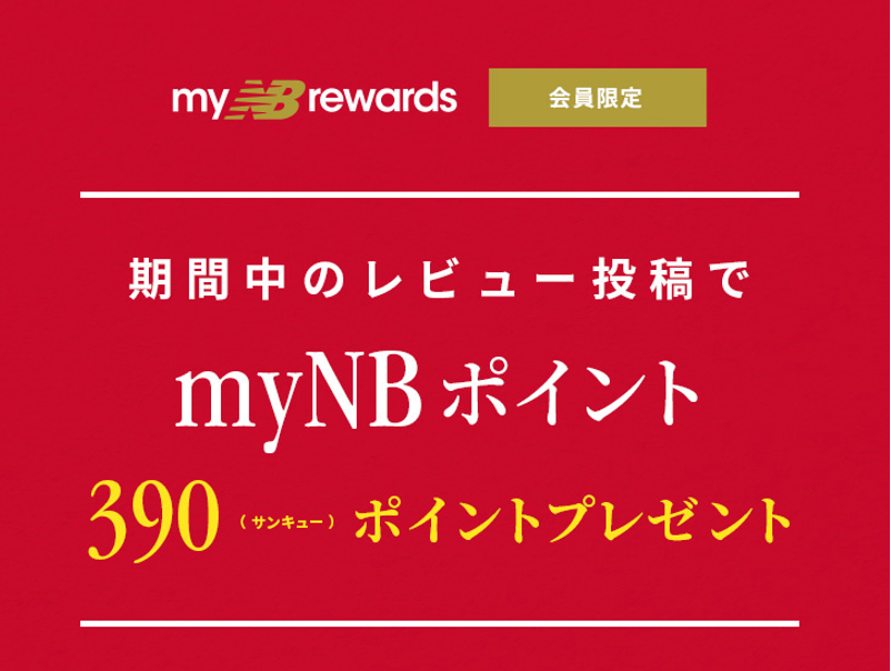 期間中、ニューバランスmyNB会員限定でレビュー投稿を実施頂いた方に、myNBポイント、390(サンキュー)ポイントをプレゼントいたします。