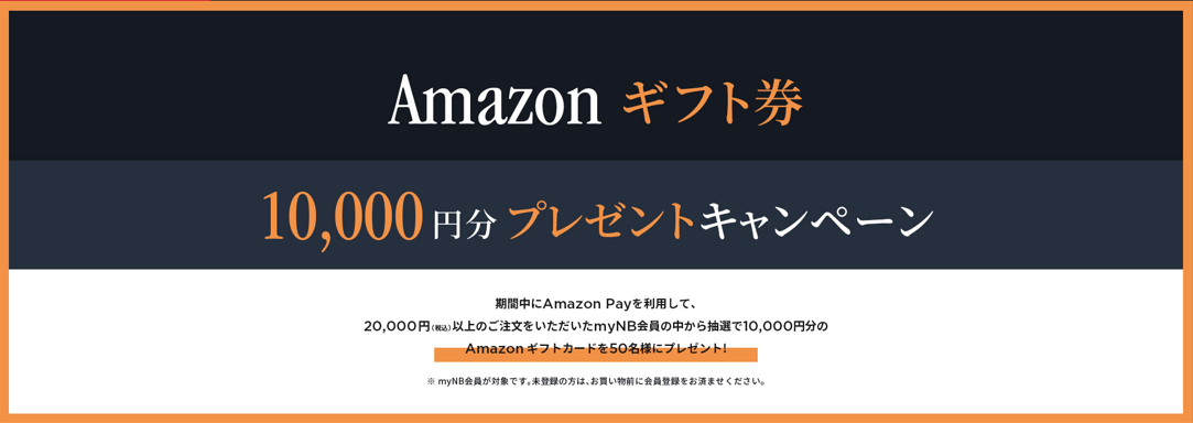 期間中にAmazon Payを利用して、20,000円(税込)以上のご注文をいただいたmyNB会員の方限定で、10,000円分のAmazon ギフトカードを抽選で50名様にプレゼントいたします。