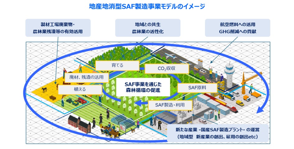 JALグループでは、2030年度に全燃料搭載量の10%をSAFに置き換えるという目標を掲げ、業界を越えた国内外のステークホルダーとの協働を通じて国産SAFの製造・商用化を目指しています。今回の取り組みによって地域に密着し、その土地の木材をその土地で使う「地産地消型SAF事業」を立ち上げ、国内ネットワーク各地でのSAF供給に繋げていくほか、地域活性化を促します。また国産木材を活用してSAFをつくることを通じて、森林資源を適切なサイクルで利用を進めることで森林循環を促し、SDGs課題のひとつである持続可能な森林経営にも貢献し、自然が持つ本来の力を生かした脱炭素社会の実現へ向けて取り組んでまいります。