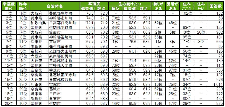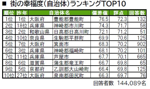 ■街の幸福度(自治体)トップは、3年連続で大阪府豊能郡豊能町