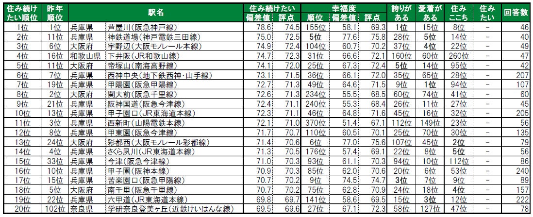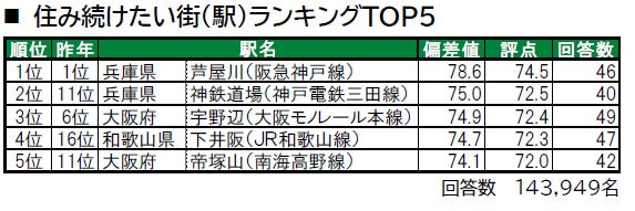 ●昨年から順位を上げてトップ10入りした駅は、2位神戸市北区に位置する神鉄道場(昨年同率11位)、4位紀の川市に位置する下井阪(昨年16位)、5位大阪市住吉区に位置する帝塚山(昨年同率11位)、7位西宮市に位置する甲陽園(昨年19位)、9位西宮市に位置する阪神国道(昨年21位)、10位西宮市に位置する甲子園口(昨年13位)です。