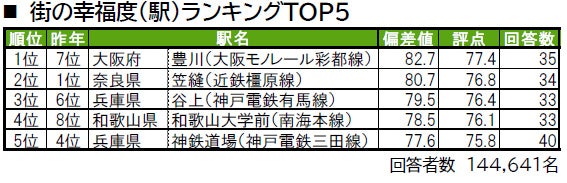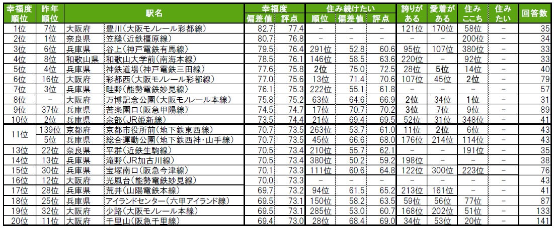 1位は茨木市に位置する豊川で、昨年7位から順位を上げました。2位は磯城郡田原本町に位置する笠縫で、トップ2は偏差値80台の極めて高い評価を得ています。3位は神戸市北区に位置する谷上です。トップ10内で今回初登場の駅は、8位の吹田市に位置する万博記念公園で、昨年は累計回答数が30名未満でランキング集計対象外でした。その他順位を上げた駅は、6位茨木市に位置する彩都西(昨年16位)、9位西宮市に位置する苦楽園口(昨年37位)です。