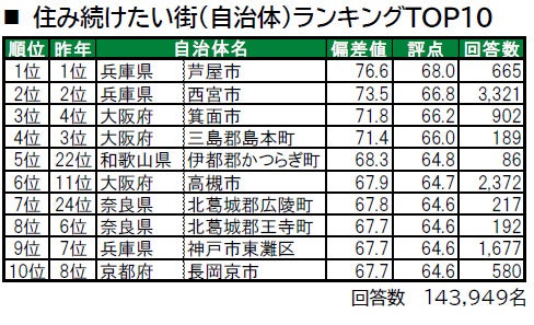1位は2年連続で兵庫県芦屋市で、「住みここち(自治体)」でも1位の自治体です。2位も2年連続で兵庫県西宮市です。3位は、大阪府箕面市です。トップ10内では、5位和歌山県伊都郡かつらぎ町(昨年22位)、6位大阪府高槻市(昨年11位)、7位奈良県北葛城郡広陵町(昨年24位)が昨年から順位を上げてトップ10入りしています。