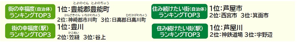 •「街の幸福度(駅)・住み続けたい街(駅)」は、駅徒歩15分以内に居住している回答者が30名以上の駅を、「街の幸福度(自治体)・住み続けたい街(自治体)」は、回答者50名以上の自治体を対象として集計しています。