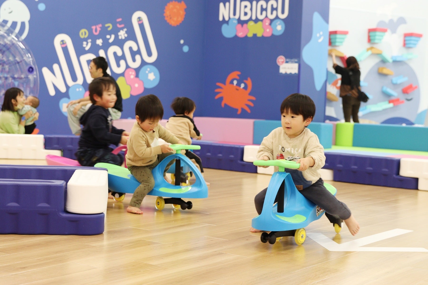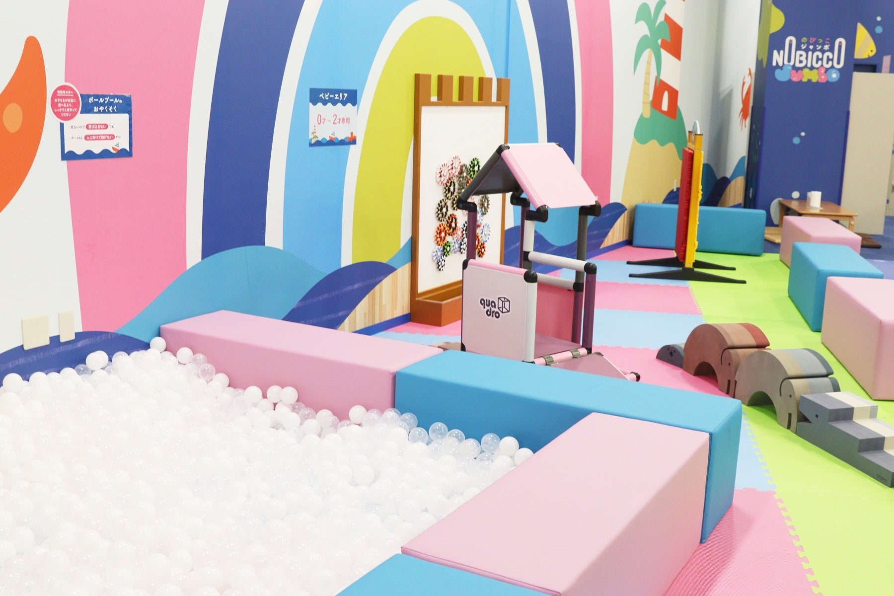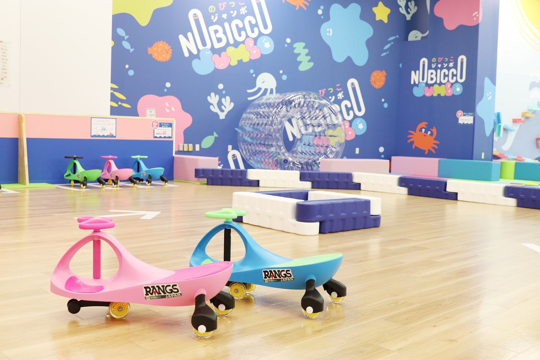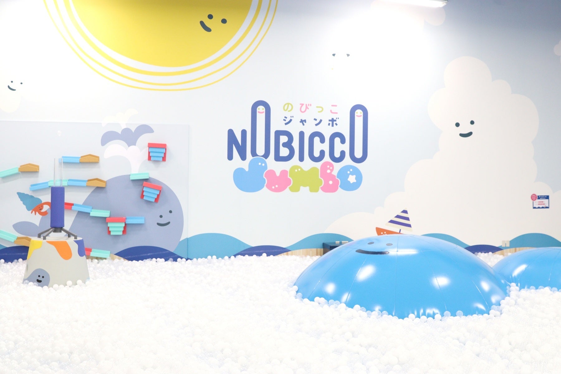 「のびっこジャンボ」は、「家族で1日あそび放題!楽しさジャンボなプレイグラウンド」をコンセプトに、お子さまがのびのびとからだを動かして遊べるコンテンツが満載です。青い海が広がるような開放的な空間に、ボールプールや大型ブロック、なりきり遊びコーナー、サーキットコーナーやブランコなど、たくさんの遊びがあり、家族で丸一日楽しめる施設です。