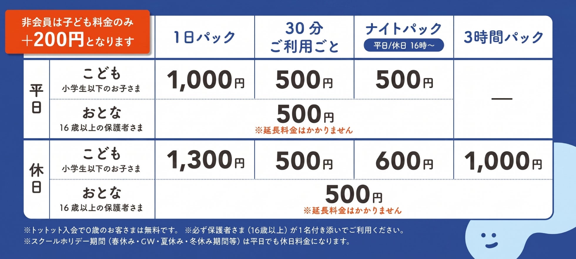 ・上記料金は、無料子育て応援アプリ「トットット」に会員登録された方の会員料金です。入場当日にご登録いただいた場合も、当日から会員料金が適用されます。非会員さまは子ども料金のみ+200円となります。