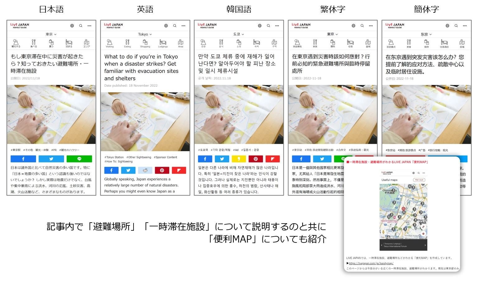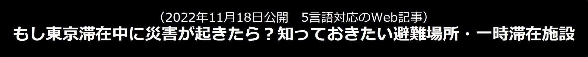 また、「LIVE JAPAN」では東京を訪れる外国人に向けて、「避難場所」「一時滞在施設」に関する情報をまとめた多言語記事を作成し、2022年11月18日に公開しました。
