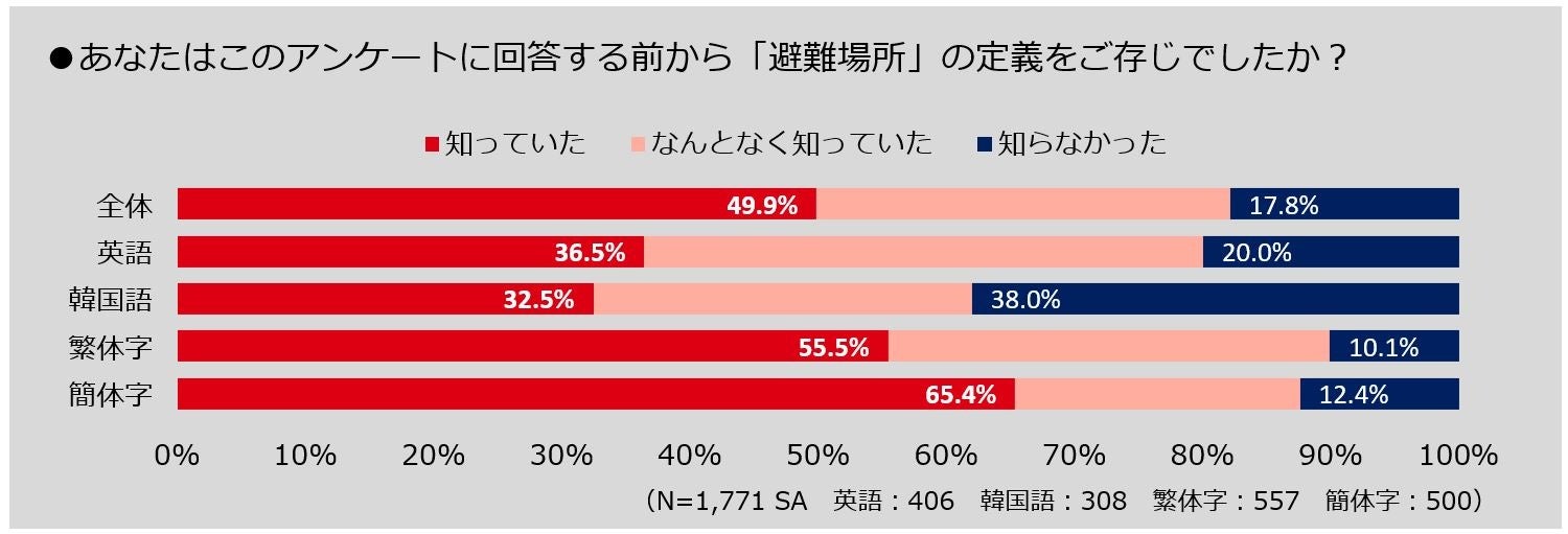 その結果、「避難場所」について知っていた人は全体では49.9%。「一時滞在施設」について知っていた人は全体の36.3%と「避難場所」を下回る結果になりました。