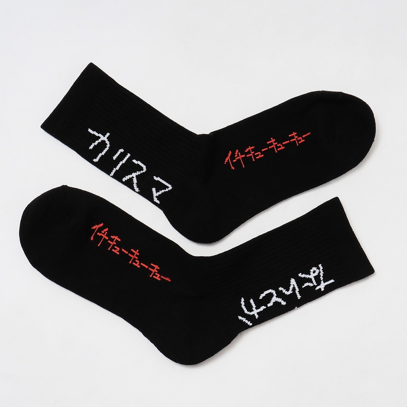 1999年に流行した「カリスマ〇〇」を「カリスマなんとか」と表現したアートをバックに配したソックス。甲部分の「イチキューキューキュー」や足裏のコラボロゴなど見えない部分にもこだわった一足。