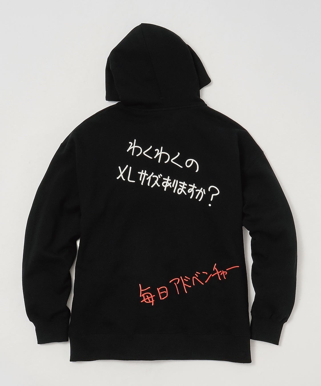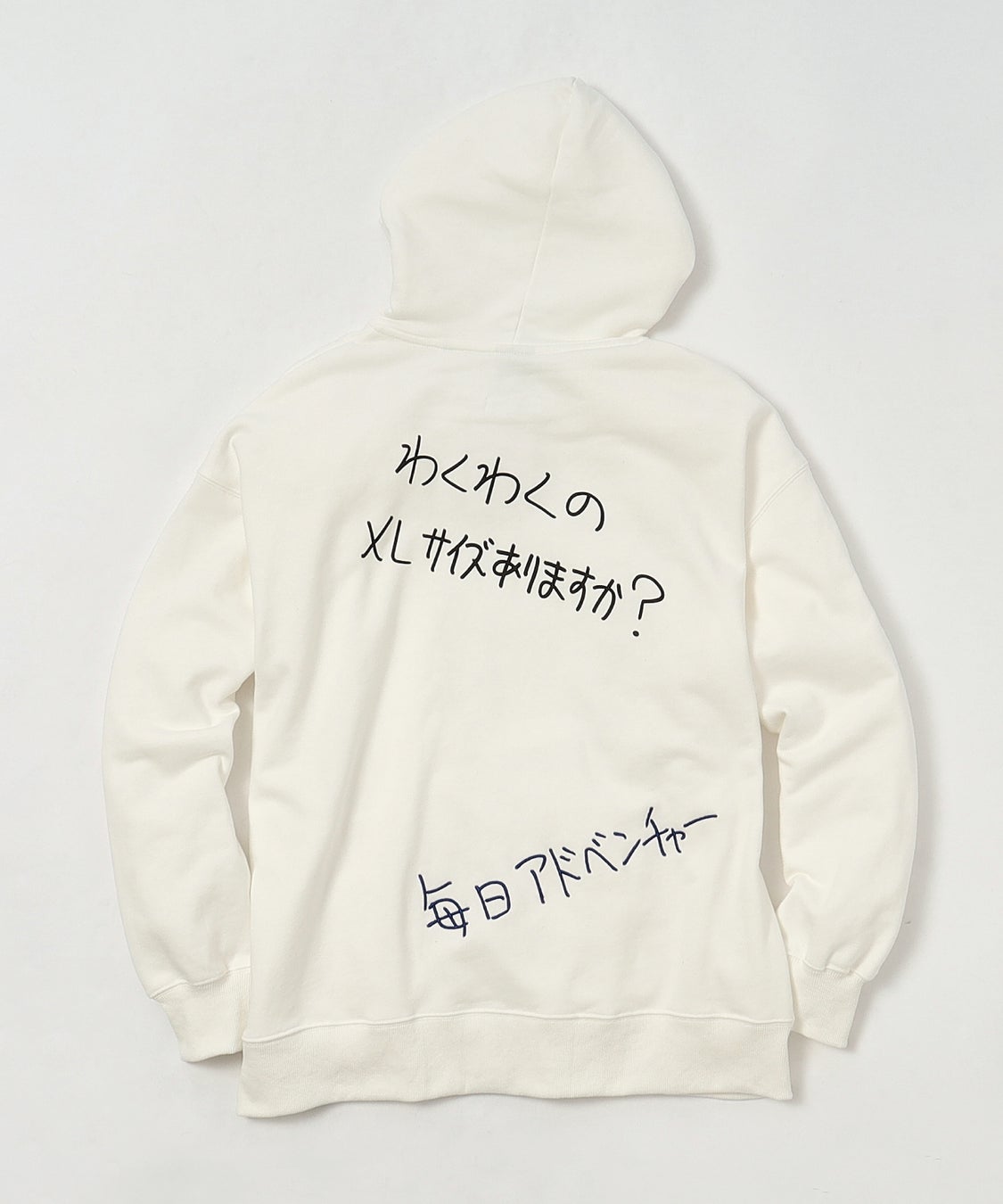 25周年のテーマである「毎日アドベンチャー」をはじめ、ブランド創設年の1999年にまつわるワードをちりばめた、ユーモアあふれるデザインのパーカーは、発泡プリントや刺繍を使い、立体感のある仕様。さりげない配色もアクセントに。