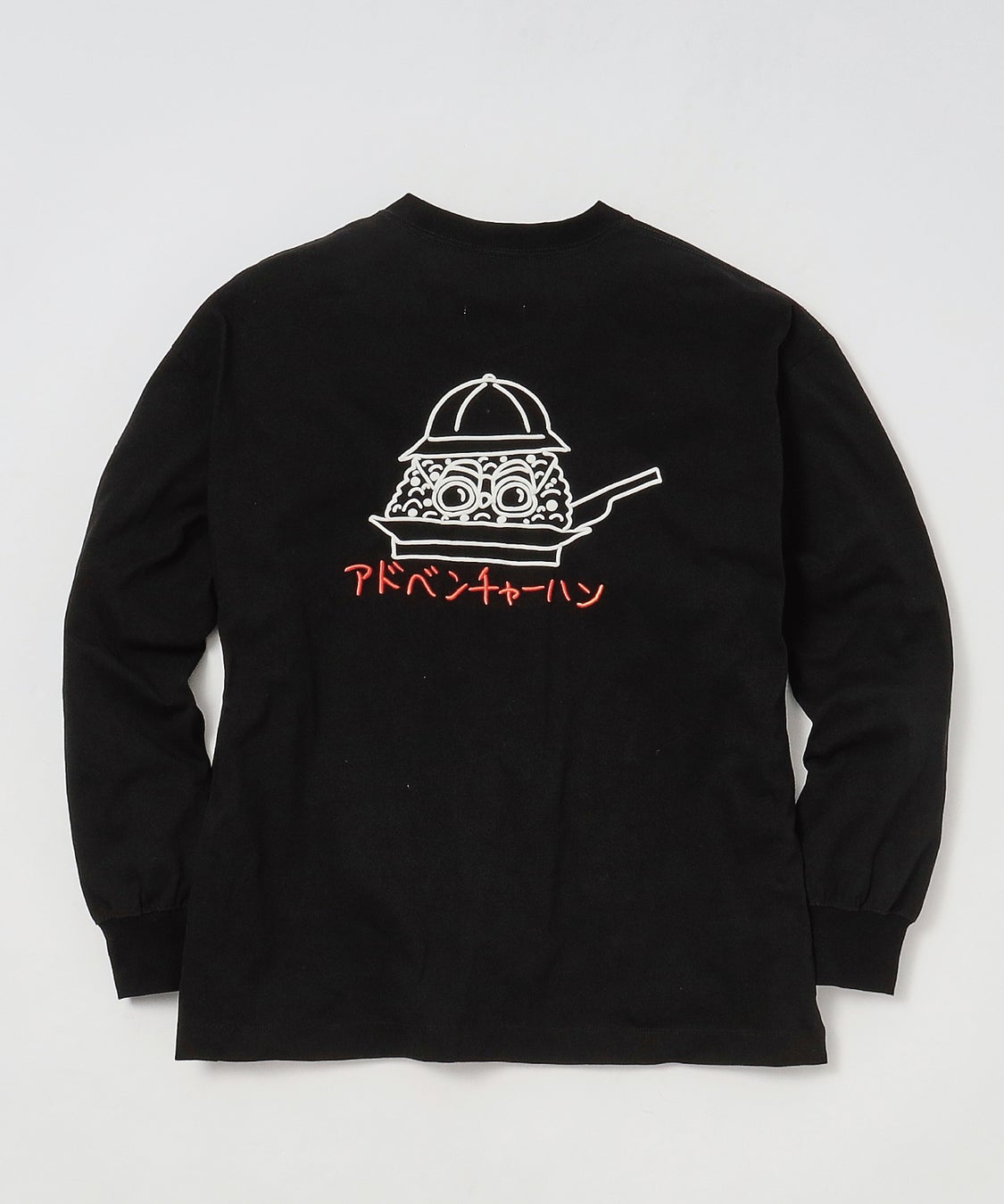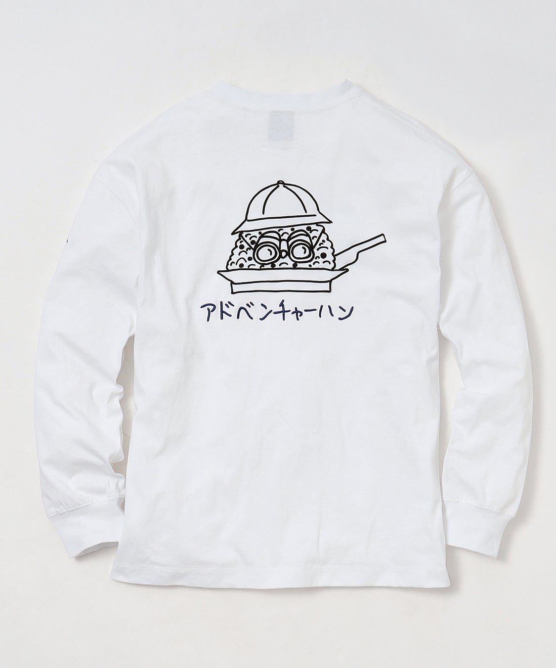 25周年のテーマである「毎日アドベンチャー」と“チャーハン”を掛け合わせた「アドベンチャー飯」というワードアートと、探検家のような帽子と双眼鏡をモチーフにしたキャラクターを大胆にプリントした長袖Tシャツ。袖にはブランド創立の1999年を意味するアートをプリント。