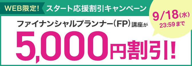 株式会社ユーキャンでは9/1(日)よりWEB限定キャンペーンを開始しました。9/18(水)まで、WEBからの受講お申込みでファイナンシャルプランナー(FP)講座の受講料を5,000円割引いたします。