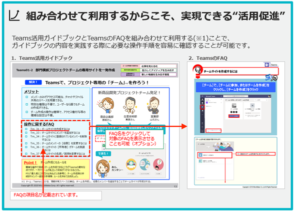 2つのコンテンツを組み合わせて利用することで、活用ガイドブックから業務課題解決に向けたTeamsの活用方法を見つけ、それらを実現するための操作方法をFAQから確認することができます。これによりTeams活用における課題を、業務と操作の両面から素早く解決に導くことが可能です。