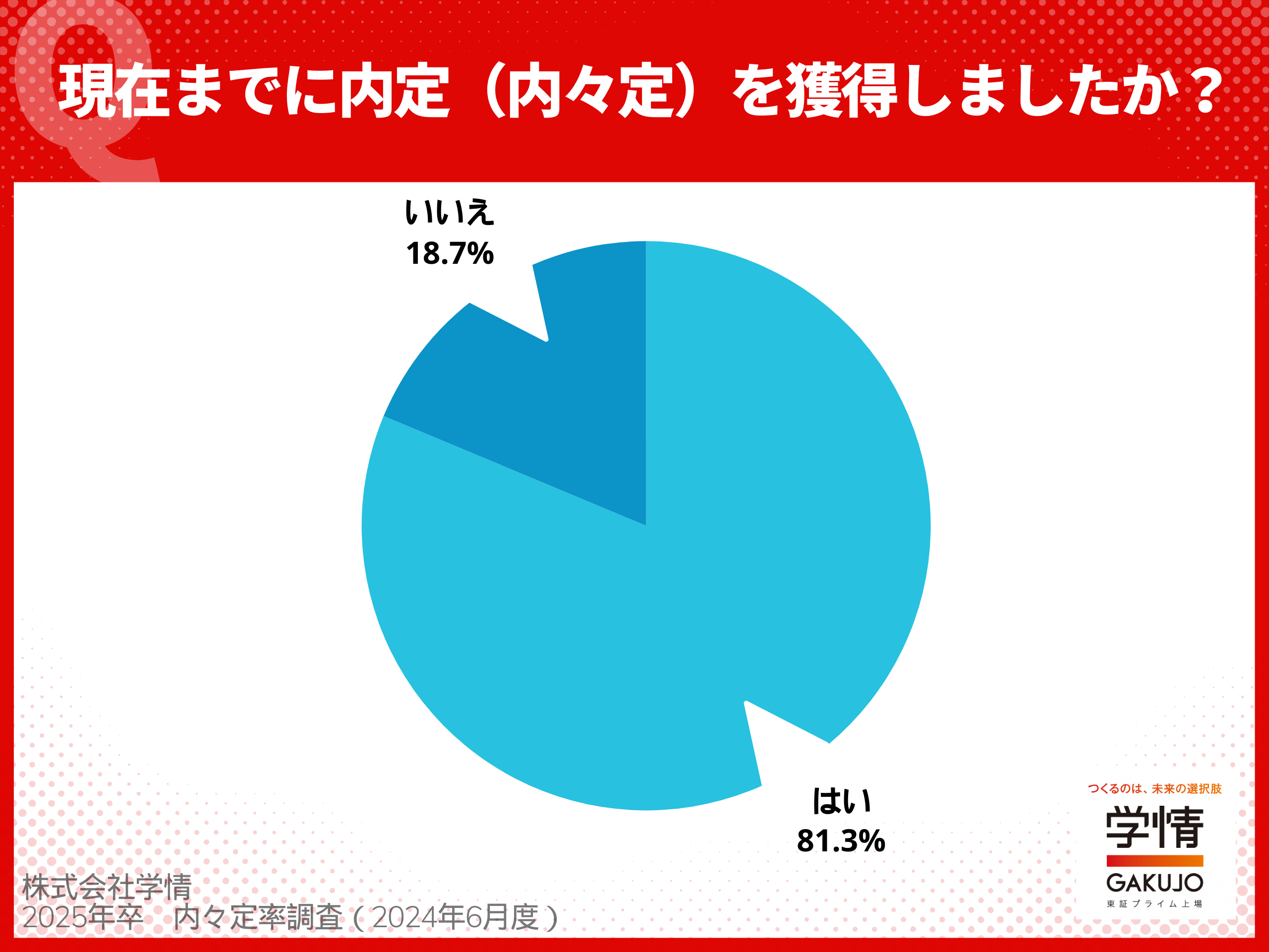 2025年卒学生の6月度の内々定率(5月末段階)は「81.3%」と、3月1日の採用広報解禁から3カ月で8割を超える結果に。4月末時点から1ヵ月で11.2ポイント伸長しており、伸び率も前月を上回る結果となっています。
