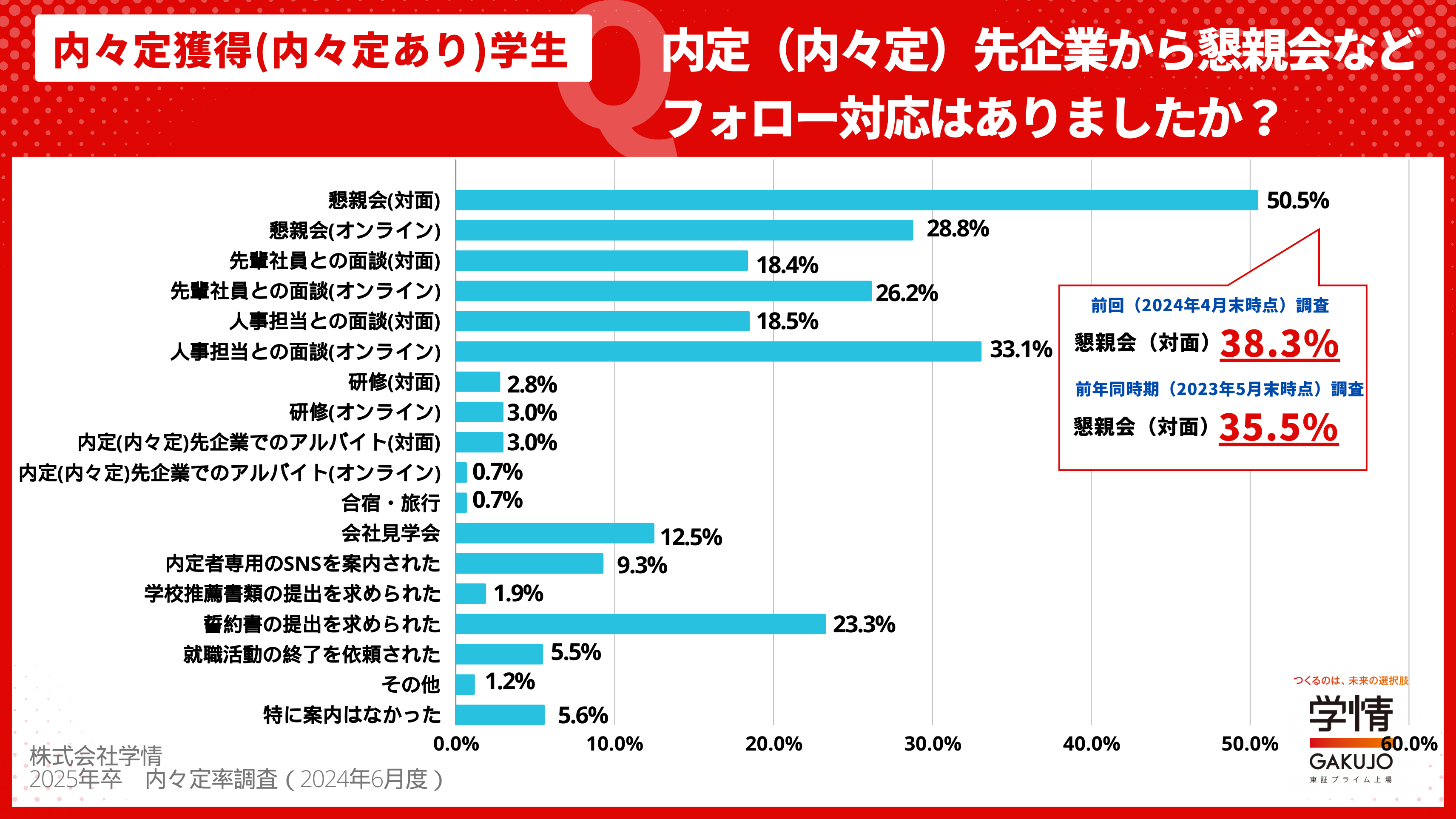 内々定獲得企業からのフォローに関して、「懇親会(対面)」と回答した学生が「50.5%」に上り、前月の「38.3%」から大きく伸長しました。前年同時期は「35.5%」という結果になっており、今年は前年と比較しても「懇親会(対面)」での内々定者フォローが増加していることがわかります。