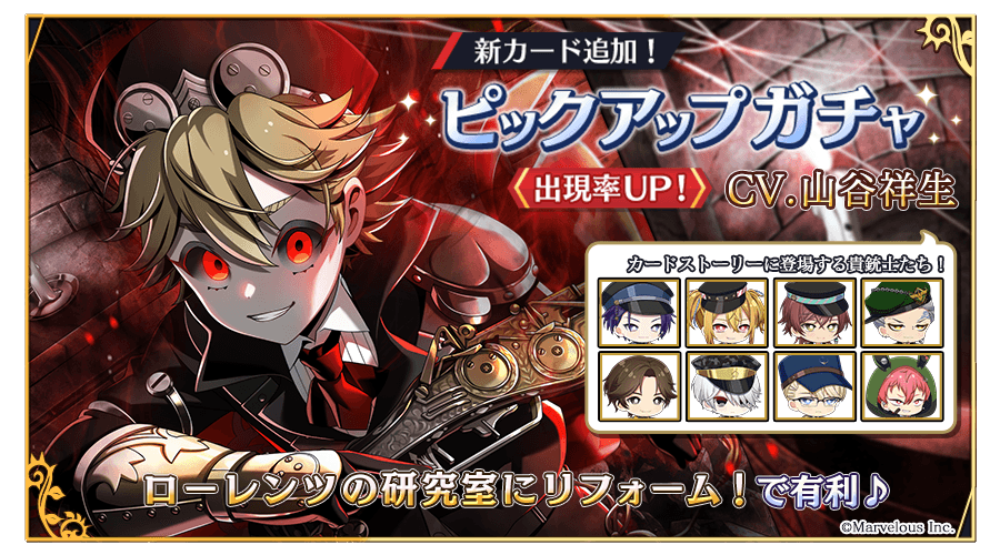 株式会社マーベラス(代表取締役社長:佐藤 澄宣/所在地:東京都品川区)による、スマートフォンゲーム『千銃士:Rhodoknight』(読み:せんじゅうし ろーどないと 以降、『千銃士R』)は、本日より本編であるロードストーリー「オーストリア編」後編の配信を開始しました。また、イベント「ローレンツの研究室にリフォーム」を開催いたします。イベント報酬に「ローレンツの研究室ルーム」を作ることができるイベント限定家具が報酬に登場します。イベントにあわせて、イベント内で活躍する★3「カール(CV: 山谷祥生)」の新カードがピックアップで登場する期間限定ガチャを開催いたします。