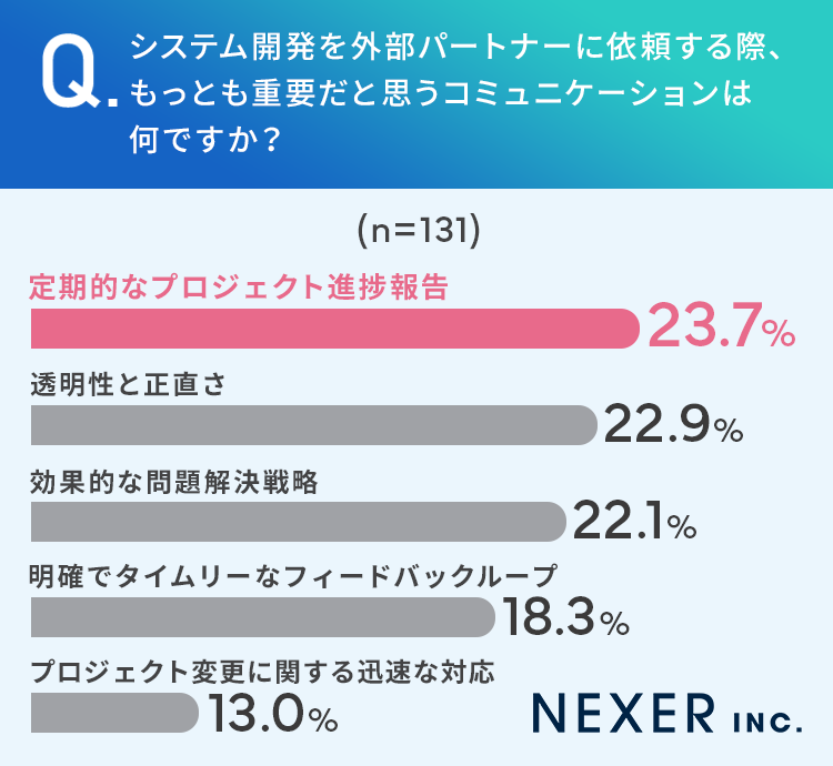 さらにシステム開発を外部パートナーに依頼する際、もっとも重要だと思うコミュニケーションとして多く挙がっていたのは「定期的なプロジェクト進捗報告」でした。