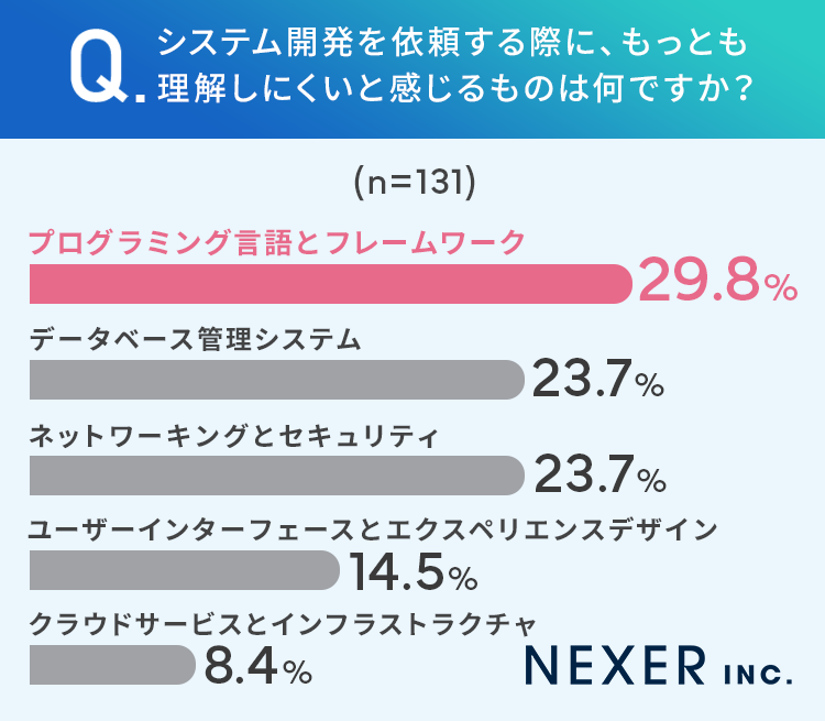 ■システム開発を依頼する際にもっとも理解しにくいと感じるもの、29.8%が「プログラミング言語とフレームワーク」