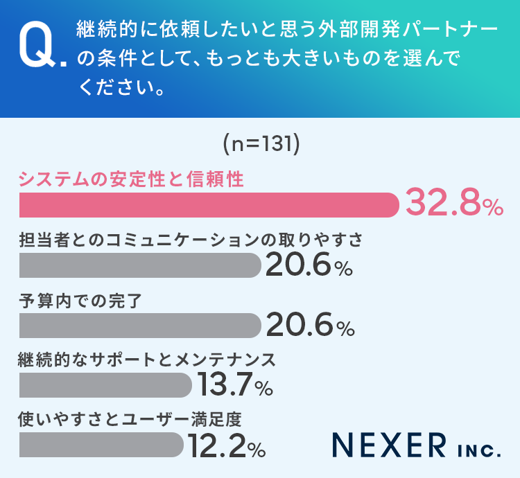 最後に継続的に依頼したいと思う外部開発パートナーの条件として、もっとも大きいものを1つだけ選んでもらいました。
