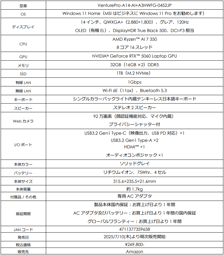 14インチ、Ryzen AI 7、RTX 5060搭載Copilot+ PCビジネスノート誕生!!Amazon限定モデル「VenturePro-A14-AI+A3HWFG-0452JP」発売