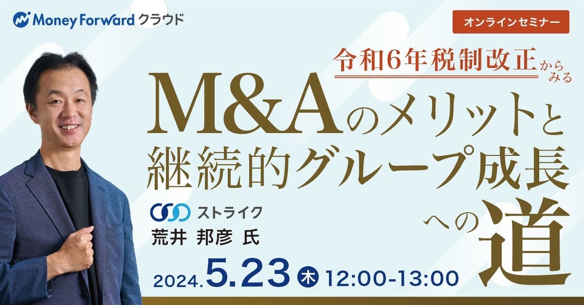 株式会社マネーフォワードは、2024年5月23日(木)12:00より、M&Aやグループ拡大を検討している企業に向けたセミナー「〜M&Aの第一線で活躍する株式会社ストライク 代表取締役社長が語る〜 令和6年税制改正からみるM&Aのメリットと継続的グループ成長への道」をオンラインで開催します。