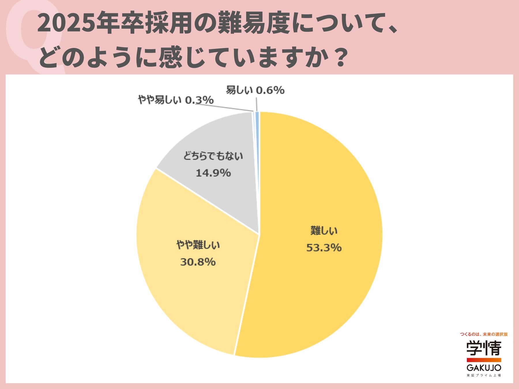 2025年卒採用では、3年生の5月末時点で「内定率」が8割を超えるなど、学生優位な売り手市場感が強まっています。企業は、2025年卒採用の難易度をどのように捉えているかアンケートを実施しました。