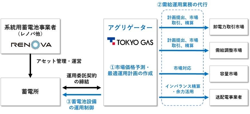 東京ガス株式会社(社長:笹山 晋一、以下「東京ガス」)は、このたび、系統用蓄電池の最適運用サービス(以下「本サービス」)の提供を開始します。初号案件として、株式会社レノバ(社長:木南 陽介、以下「レノバ」)が開発する2か所の蓄電所 計165MW(*1) について、需給運用業務を受託しました。東京ガスは運用受託期間(2028年度から20年超)にわたり、容量市場への対応のみならず、卸電力取引市場や需給調整市場等の複数市場での活用(マルチユース)による最適な需給運用を実施します。