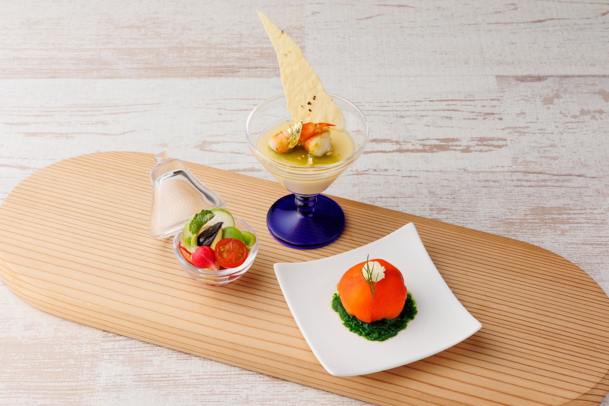 ・筍のフラン 海老のローストに抹茶のジェノベーズ風と