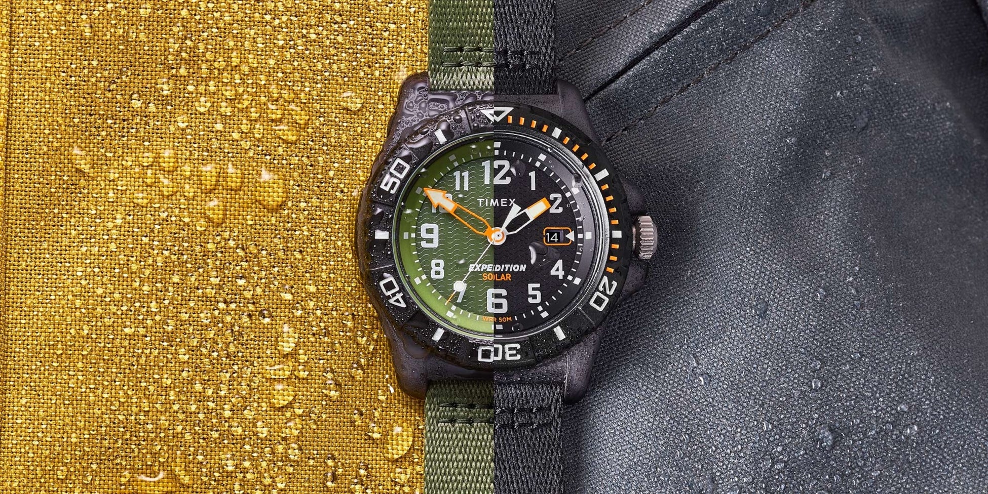 海洋プラスチックを100%再生利用したスイス・タイド社の素材をケースとストラップに取り入れた、サステナブルで50m防水を実現した、アウトドア向けのエクスペディションシリーズの新作「フリーダイブ オーシャン」。