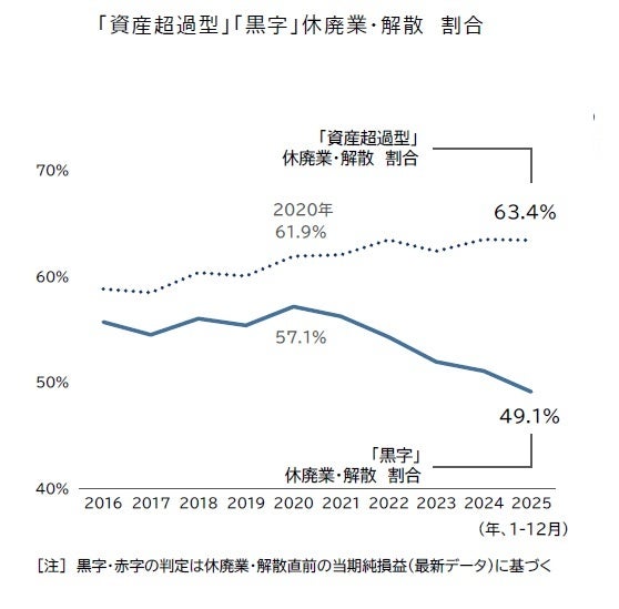 2025年に休廃業となった企業のうち、保有資産の総額が債務を上回る状態で休廃業した件数=「資産超過型」の割合は63.4%となり、2年ぶりに前年を下回った。また、休廃業する直前期の決算で当期純損益が「黒字」だった割合は49.1%となった。2020年(57.1%)をピークに5年連続で低下し、遡及可能な2016年以降で初めて50%を下回った。この結果、「資産超過」状態かつ当期純損益が「黒字」となった企業の割合は15.2%となり、2年連続で低下した。2025年の休廃業・解散動向は総じて、足元の物価高や人件費などのコスト上昇を受け、損益が悪化した企業の割合が高まった点が特徴といえる。