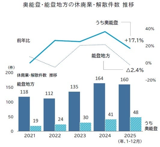 最大震度7を観測した令和6年能登半島地震の発生から2年が経過した。こうしたなか、震源に近く、被害が甚大だった奥能登2市2町の「奥能登」地方における休廃業・解散件数は48件判明した。前年から7件・17.1%増加し、震災前の過去5年平均(2019~23年:23件)から倍増、過去10年で最多だった。奥能登を含めた「能登地方 」全体の休廃業・解散は160件発生し、前年から減少となった。