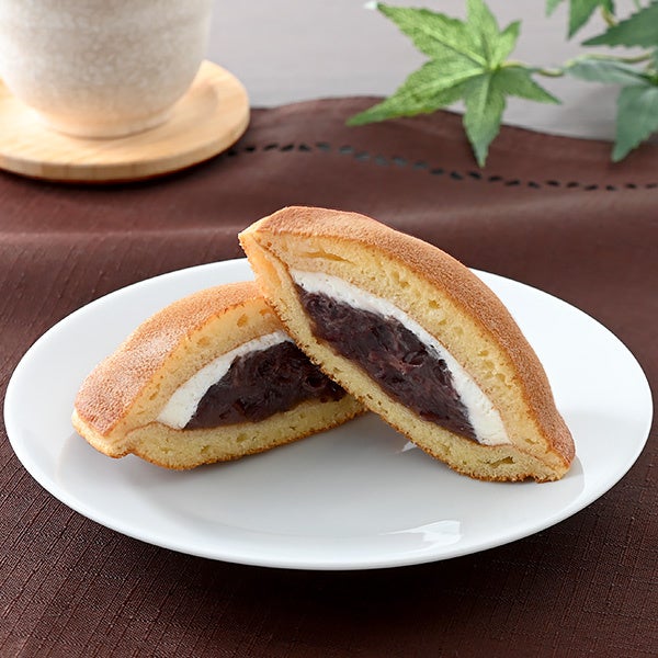 【内容】北海道産小豆のつぶあんと生クリーム入りのホイップクリームをサンドしたもちもち食感のどら焼きです。もち粉や山芋粉を配合して、もっちりとした食感の生地が特長です。