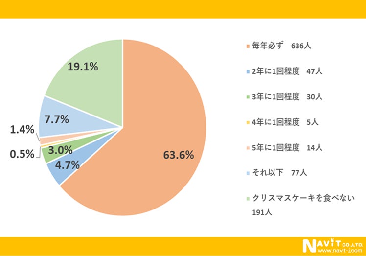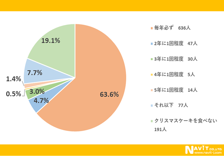 クリスマスケーキを食べる頻度は「毎年必ず」が最も多くて63.6%。今年食べる予定の人のうち、ほとんどが毎年食べていることがうかがえます。