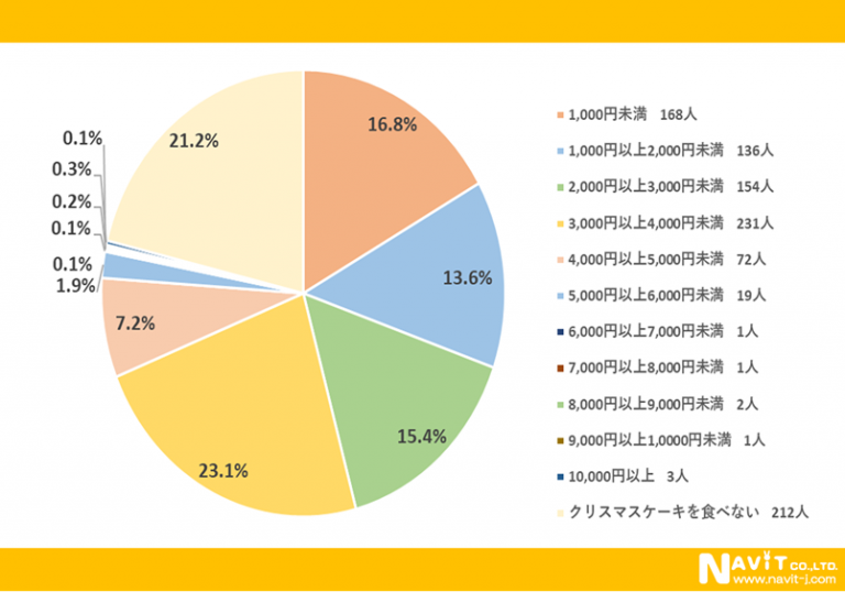 購入するクリスマスケーキの予算は「3000円以上4000円未満」が一番多くて23.1%。次に多いのは「1000円未満」の16.8%でした。