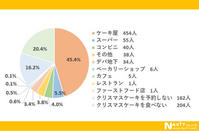クリスマスケーキを予約するのは「ケーキ屋」が圧倒的に多くて45.4%。「予約しない」人も16.2%いました。