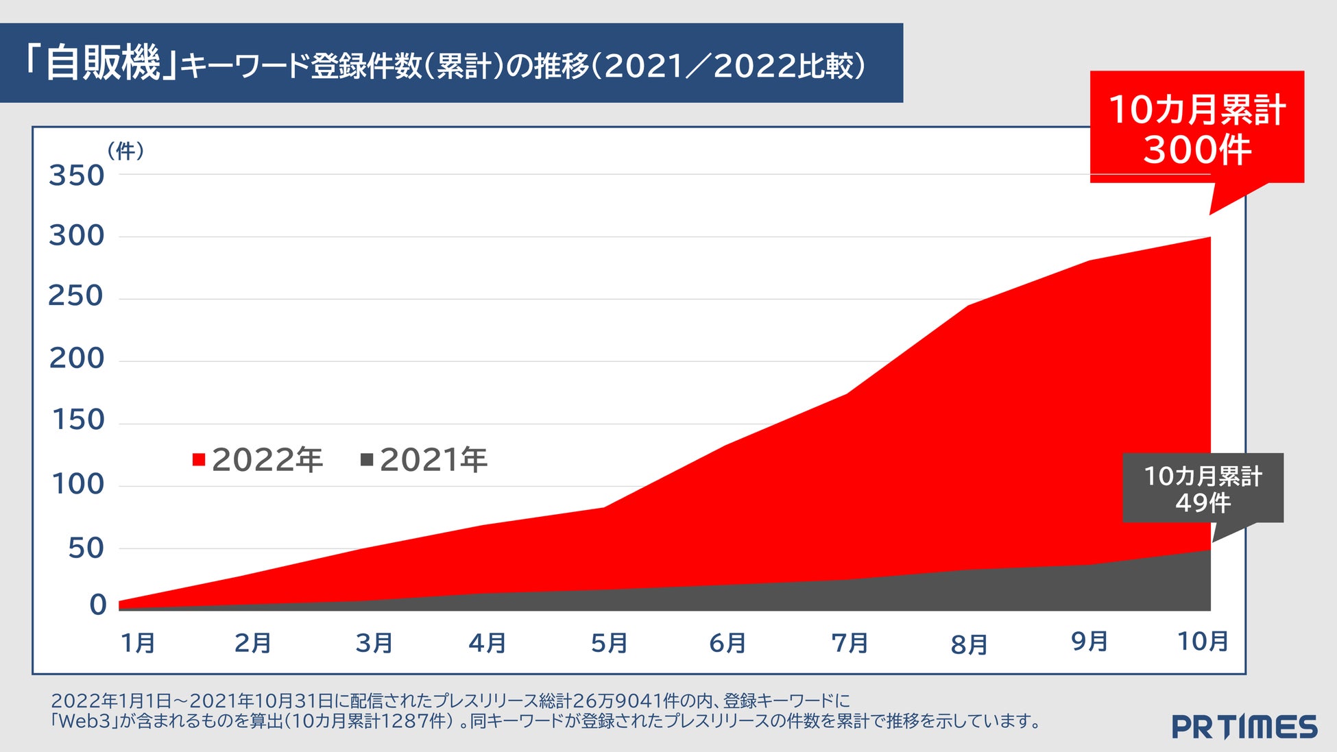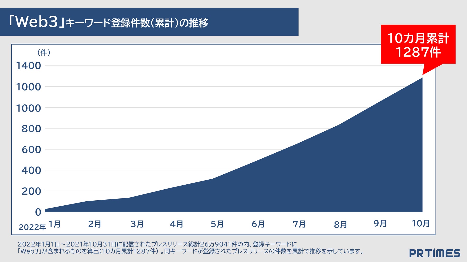 新たに「Web3」を活用した次世代のWebサービスの誕生が期待される中で、大企業の新規事業参入や提携に関するプレスリリースが多数発表されています。また、複数のVCから数十~百億円超規模の「Web3」に特化したファンドの組成がプレスリリース発表されています。2022年内で見ても、1月には28件だったキーワード登録件数は、10月には226件と8倍超に伸び、10か月累計で1287件のキーワード登録がされており、今後さらに増えていくことが予想されます。