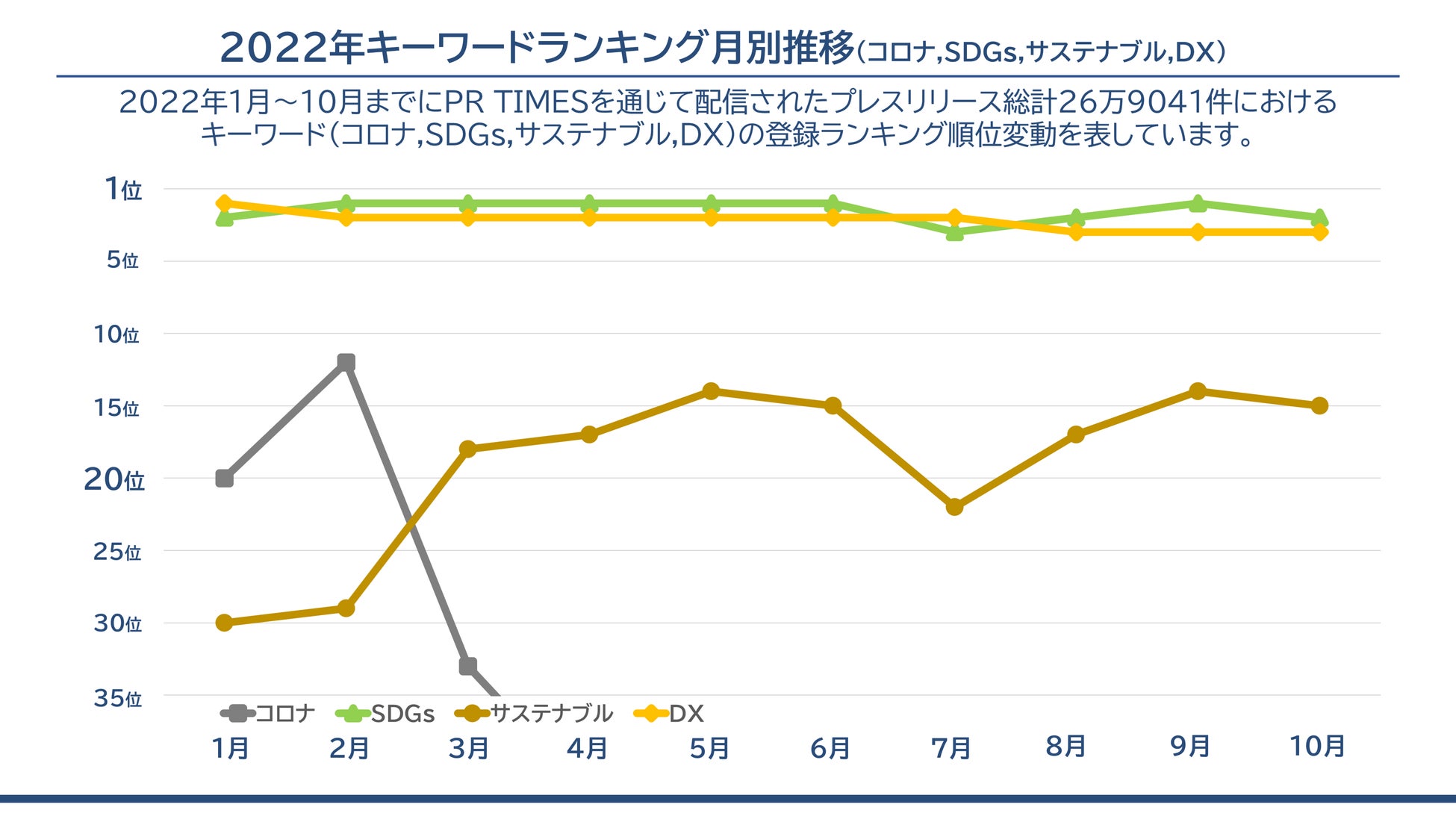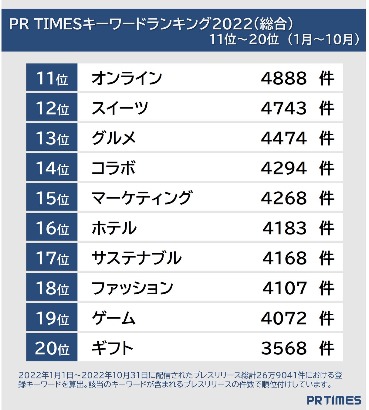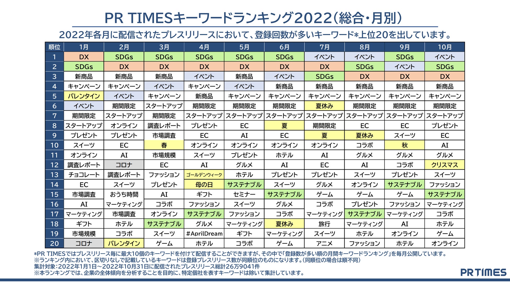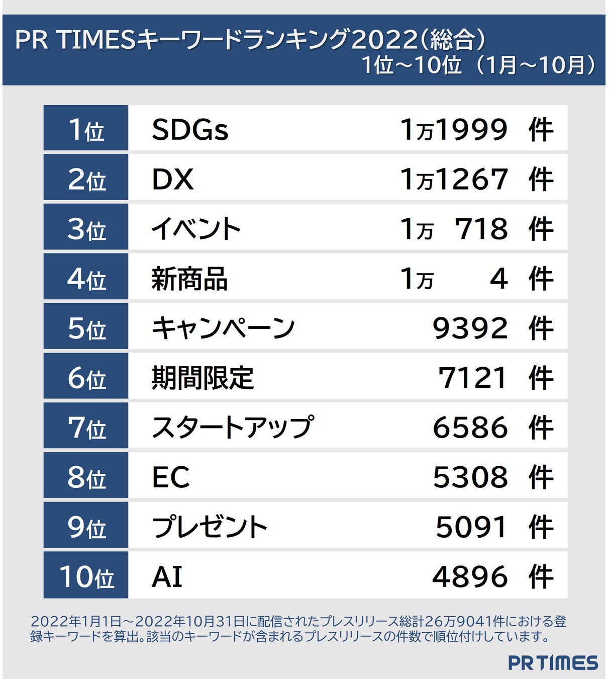 PR TIMESキーワードランキング2022(総合)では、キーワードが登録されたプレスリリース件数で2022年1月~10月の総合ランキングを集計しました。