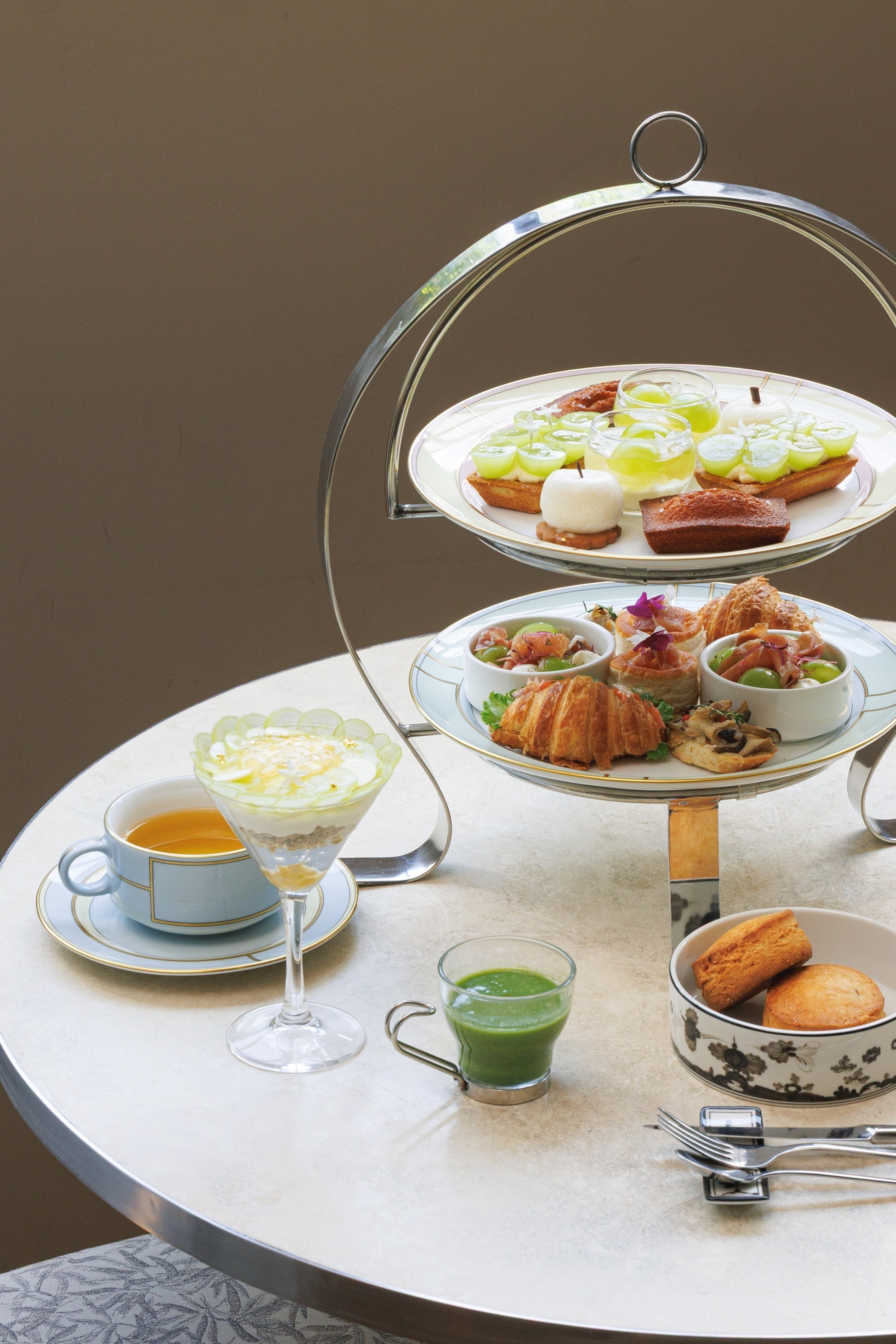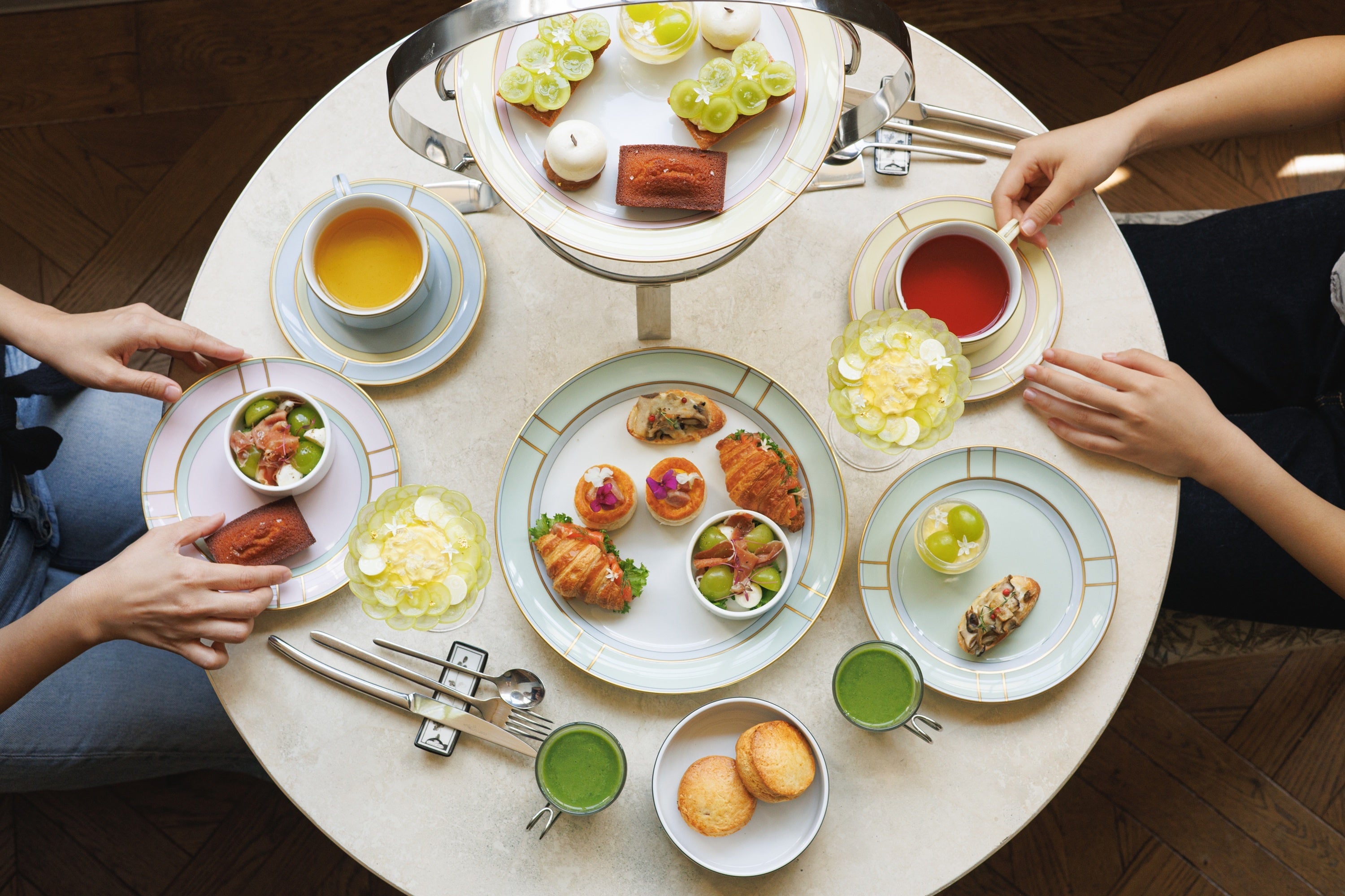 旬のシャインマスカットを存分に味わえる贅沢なアフタヌーンティー。甘美な香りと瑞々しさをスイーツにもセイボリーにも巧みに織り込みました。「GINORI 1735」の素敵な食器で味わう優雅な時間をお楽しみください。