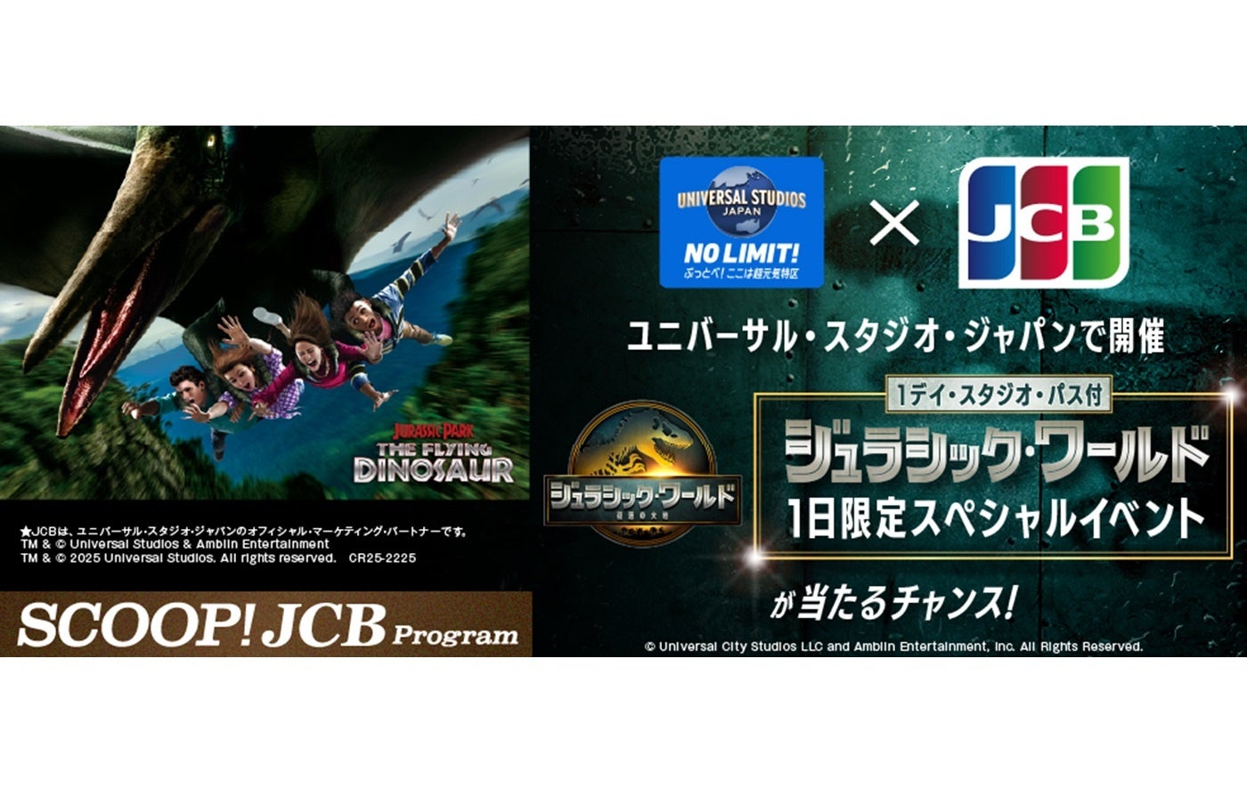株式会社ジェーシービー(本社:東京都港区、代表取締役会長兼執行役員社長:二重 孝好、以下:JCB)は、2025年8月1日(金)から9月15日(月・祝)まで、映画『ジュラシック・ワールド/復活の大地』の公開を記念して、ユニバーサル・スタジオ・ジャパン 1デイ・スタジオ・パスと、ユニバーサル・スタジオ・ジャパンで開催する「ジュラシック・ワールド」シリーズ最新作の特別映像鑑賞や恐竜とのグリーティングなどが体験できる1日限定スペシャルイベントへのご招待キャンペーンを実施します。