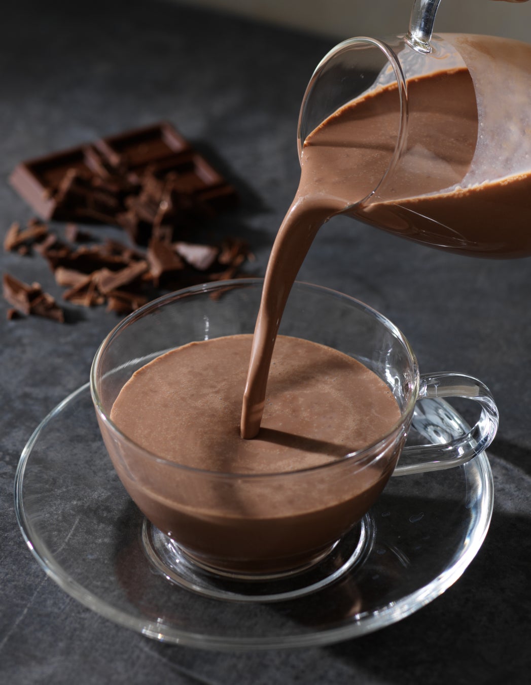 北海道産ミルクに、華やかな酸味とフルーティーな風味が特徴のカカオ分64%のチョコレートを合わせたホットショコラ。濃厚なカカオの甘く上品な香りとミルクのコクの調和をお楽しみください。