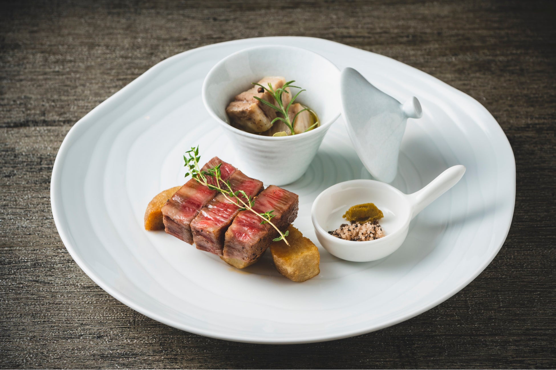 もとぶ牛サーロインのポワレ 金武町産の田芋を添えて やんばる島豚のコンフィ ローズマリーの香り
