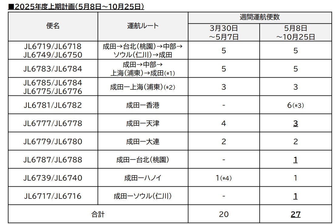 ・成田ー天津の往復路線を週3便に、成田ー台北の往復路線を週1便に変更します。